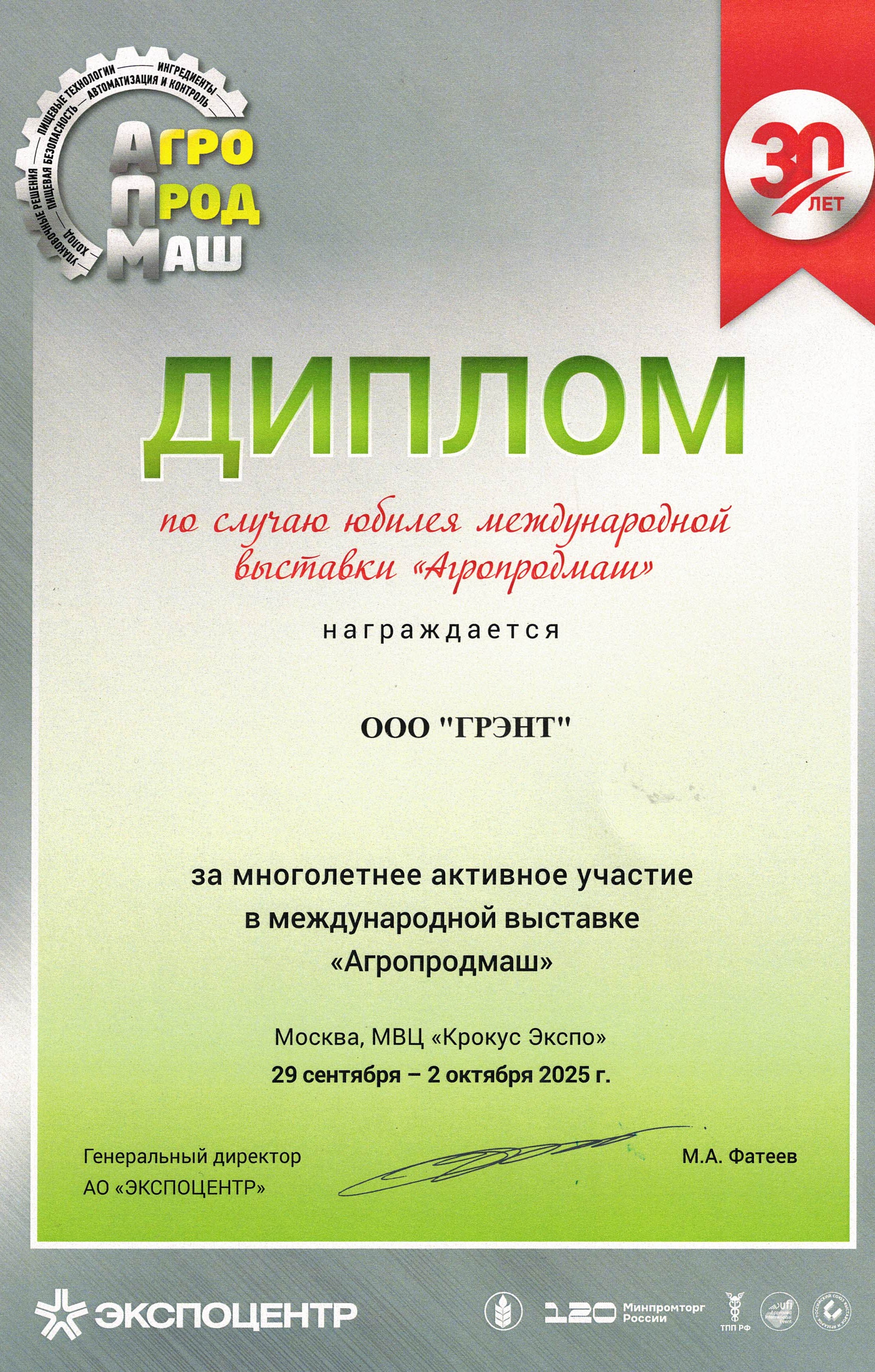 Диплом участника международной выставки "АгроПродМаш-2025"